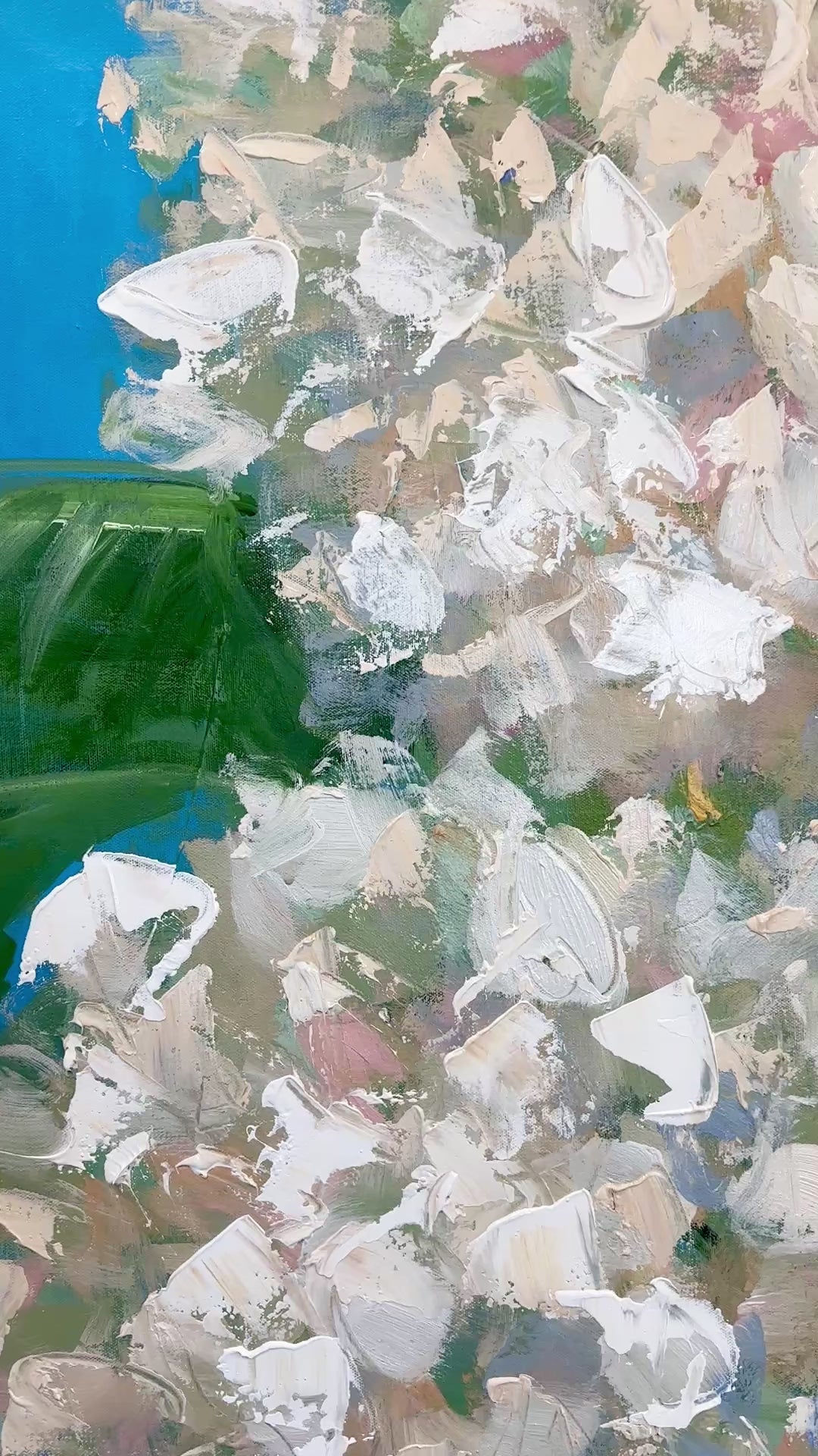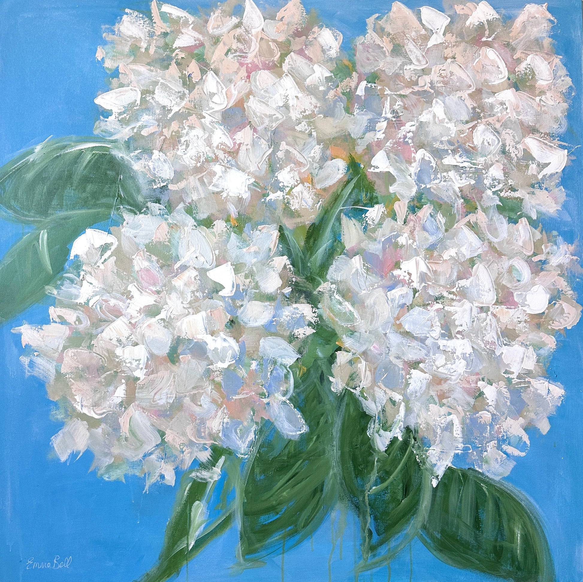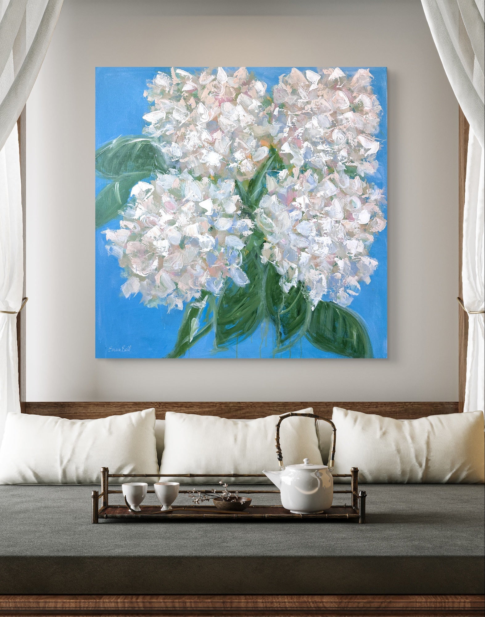 Original painting - White Hydrangeas on Blue - 48x48 with acrylic paint brush and palette knife, lots of layers of texture